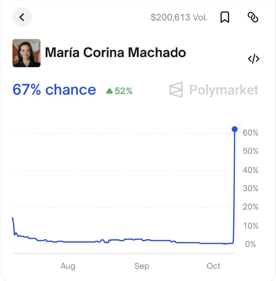 此时Machado在专家预测和媒体报道中均未被列为热门候选人,在Polymarket上的获奖概率仅为3.7%。但在“6741”的推动下,她的胜率在数分钟内飙升至31.5%,随后进一步攀升至73.5%。