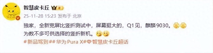 华为又要改写折叠屏规则了!11月29日,博主“智慧皮卡丘”爆料:华为一款“宽屏比竖折”新机已进入测试阶段,瞄准2026年一季度发布,搭载麒麟9030芯片,屏幕主打“超大宽画幅”,堪称竖折阵营里的“异类创新”。要知道华为已占据国内75%折叠屏市场,如今跳出“窄屏竖折”惯性,这波操作直接让行业屏住呼吸!