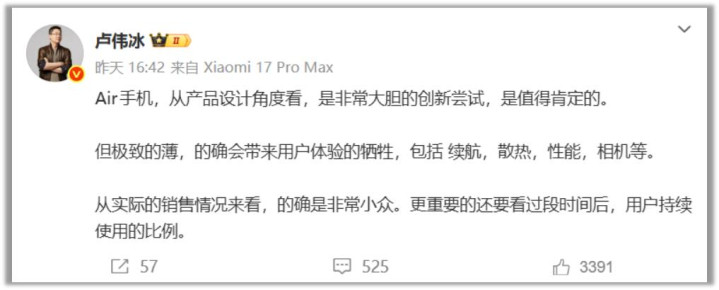 “Air手机,从产品设计角度看,是非常大胆的创新尝试,是值得肯定的。但极致的薄,的确会带来用户体验的牺牲,包括 续航,散热,性能,相机等。从实际的销售情况来看,的确是非常小众。更重要的还要看过段时间后,用户持续使用的比例。”