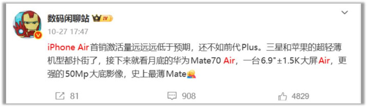 然而,据博主@数码闲聊站 透露,尽管其工艺精湛,但首周激活量仅约5万台,市场表现平平。无独有偶,华为即将推出的Mate 70 Air以“不止于薄”为口号,旨在将优雅设计与持久续航结合,但消费者是否买单仍有待市场检验。