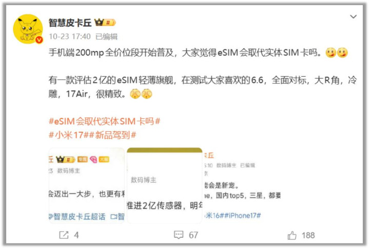去年10月,博主智慧皮卡丘曾爆料,某制造商(暗示是小米)正在测试一款基于eSIM的轻薄旗舰机,配备2亿像素主摄和一体化冷雕机身,可能命名为小米17 Air。然而,结合卢伟冰的最新表态来看,小米对此显然持谨慎态度,相较于打破记录的轻薄,公司更倾向于优先保障均衡的用户体验。