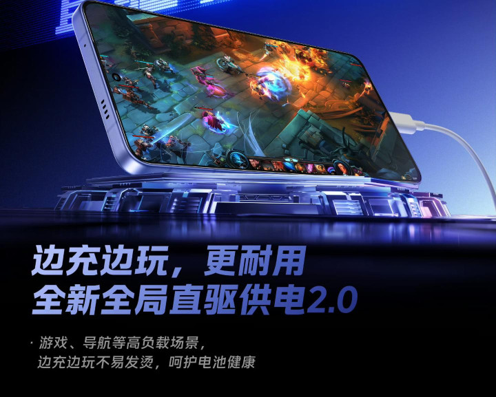 在充电功率上,将会支持100W的有线充电和40W的无线充电,以及全局直驱供电2.0,使充电器电流直接为系统供电,可以有效减少机身