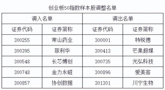 创业板50指数更换5只样本,常山药业、菲利华、长芯博创、金力永磁、协创数据等调入指数。